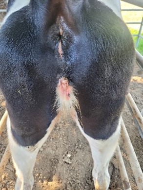 Due to the connecting blood supply in-utero, there is an exchange of cells and hormones between the foetuses, producing calves that are blood-cell chimeras. The presence of XY cells in the female foetus results in the failure to develop normal reproductive organs. Freemartins often have ovaries but lack a uterus, a cervix and only have a short vagina. There is often clitoral enlargement, and the vulva often has coarse hair present (as the photo below demonstrates).