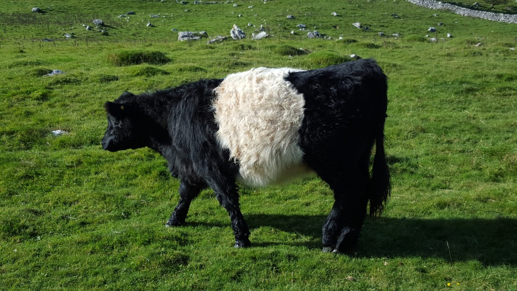 Belted Galloway: Origin: Scotland Weight: Male: 770-1000kg; Female: 450-680kg Coat: black with broad white stripe around middle Horn status: polled